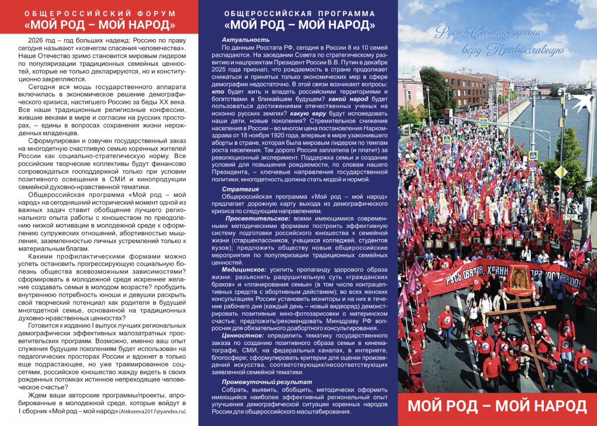 На форум «МОЙ РОД – МОЙ НАРОД» была приглашена Морозова Светлана Борисовна( председатель орг.комитета фестиваля культуры, искусства, науки и образования «СОФИЯ-РУСЬ» , директор Школы «Морозко», член Международного Союза Православных Женщин), которая представила фестивальный проект 2026 года «СРФИЯ-РУСЬ:СВЯЗЬ ПОКОЛЕНИЙ,ВРЕМЕН И ТРАДИЦИ».