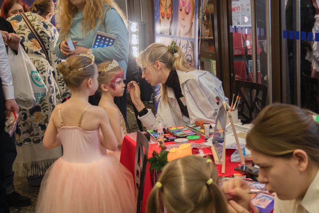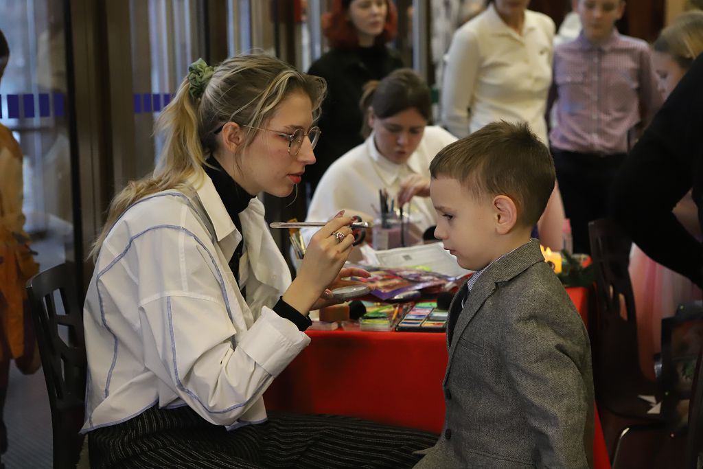 Очень красивую фотозону создали студенты Московского Художественно-Промышленного Института – в виде сказочных, снежных замков. Студенты были одеты в костюмы героев сказок, они не только фотографировали всех желающих, но и провели свои мастер-классы по изготовлению новогодних открыток. Каждый ребенок, посетивший мастер-классы педагогов Школы «Морозко» и студентов МХПИ, унесли с собой новогоднюю открытку, изготовленную своими руками.
