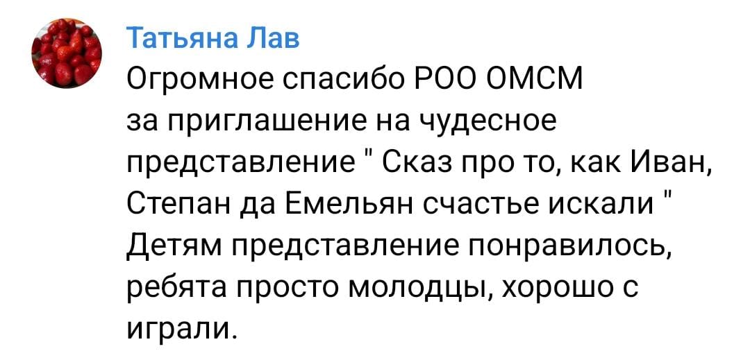 Семья Ильичёвых, выражает благодарность за возможность посетить бесплатно музыкальный спектакль"Сказ про то как Иван, Степан да Емельян счастье искали". Детям очень понравилось, было и весело, захватывающе и в тоже время волшебная, новогодняя атмосфера царила в спектакле. Спасибо за всю организацию🎄🎄🎄🎉🎉🎉