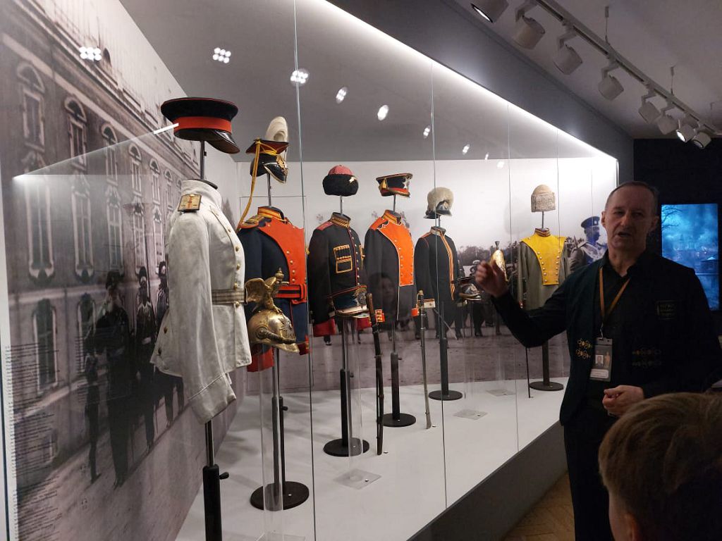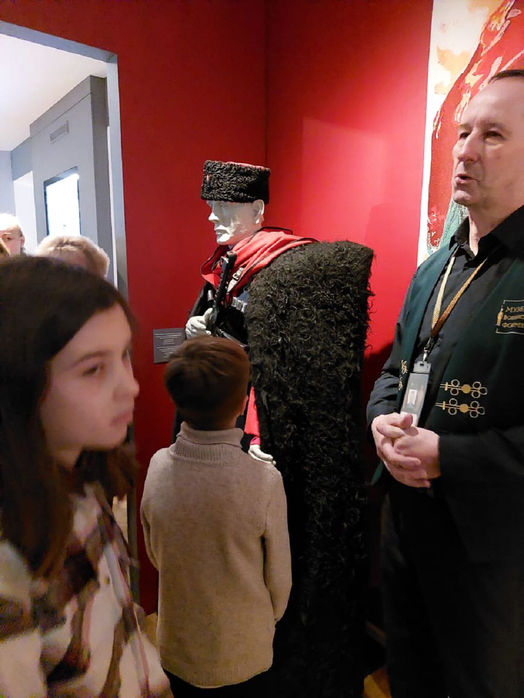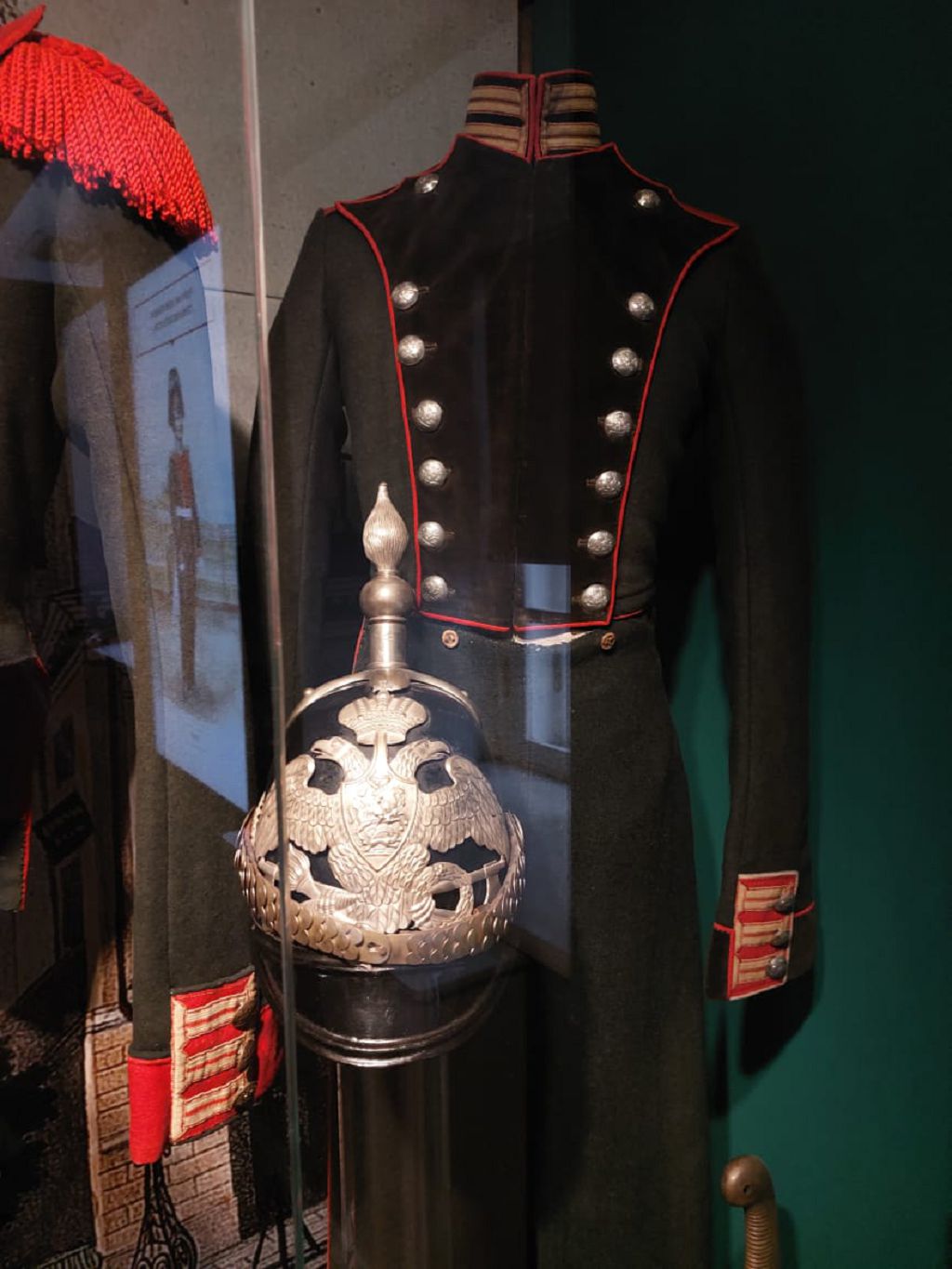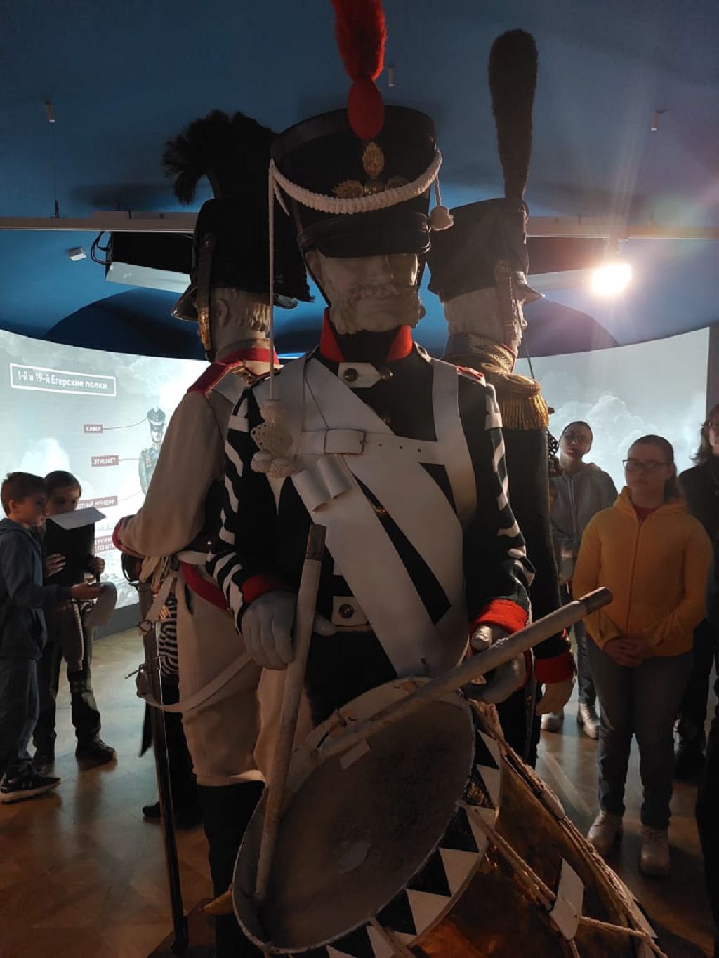 И, конечно, мы увидели, насколько красива была военная форма, особенно форма Российской Императорской Армии, которая поражает безупречным вкусом и прекрасной цветовой гаммой! Как будто изобретали и делали лекала для военной формы лучшие кутюрье того времени. Возможно, так оно и было?… Мы побывали в зале, где могли на мультимедийном экране сами собрать элементы экипировки военных разных родов войск, узнали, как называются те или иные элементы обмундирования. Узнали, кто такие гусары, кирасиры, уланы и в чем отличия в их форме, откуда вообще взялись эти невероятно красивые кивера. А после экскурсии мы смогли самостоятельно пройти по залам и еще раз не только более внимательно рассмотреть экспонаты, но даже примерить некоторые головные уборы!
