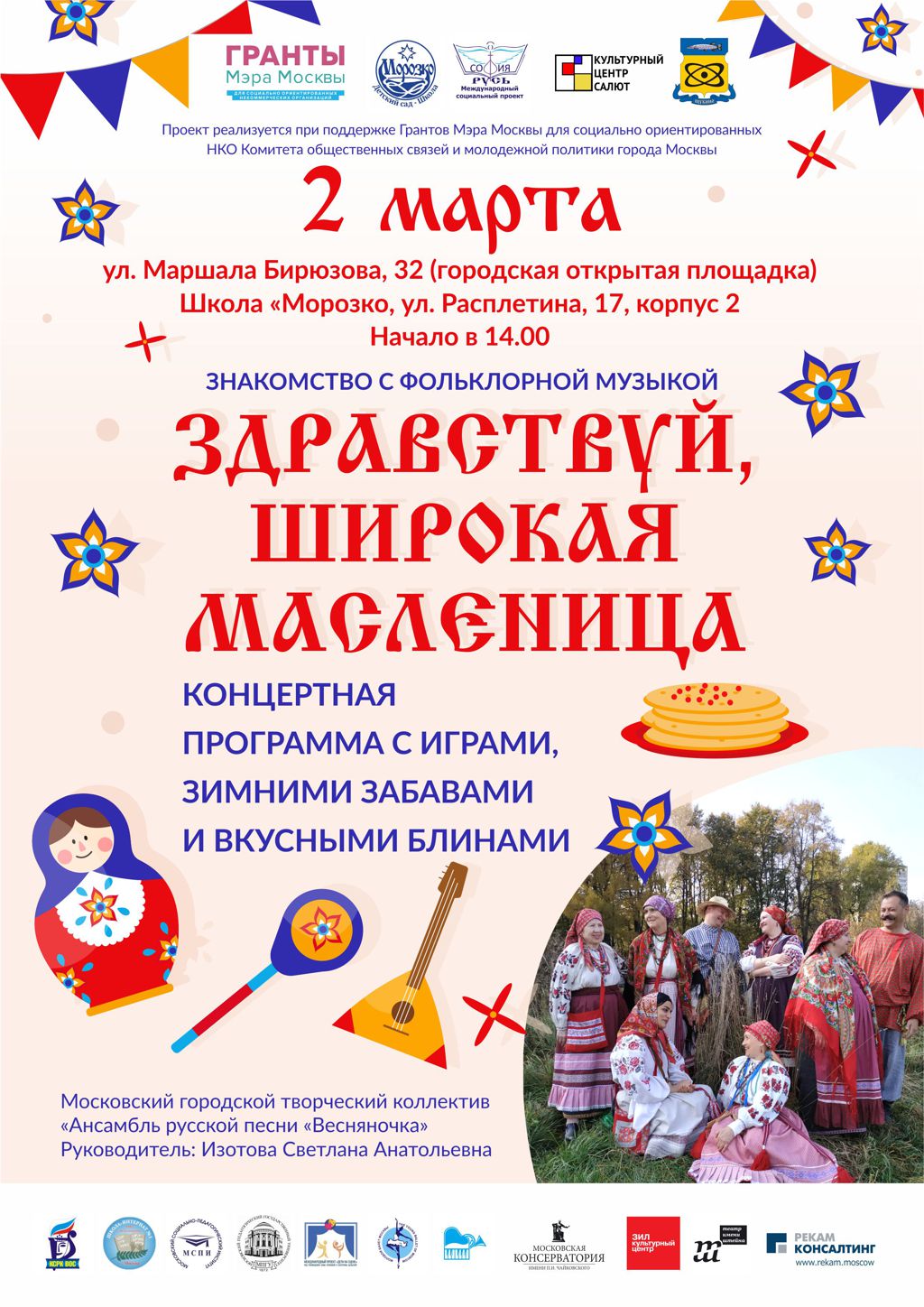 2 марта 2022 года в 14:00 в Школе «Морозко» прошло Праздничное мероприятие при поддержке конкурсов Гранта Мэра Москвы - "Здравствуй, Широкая Масленица!".
