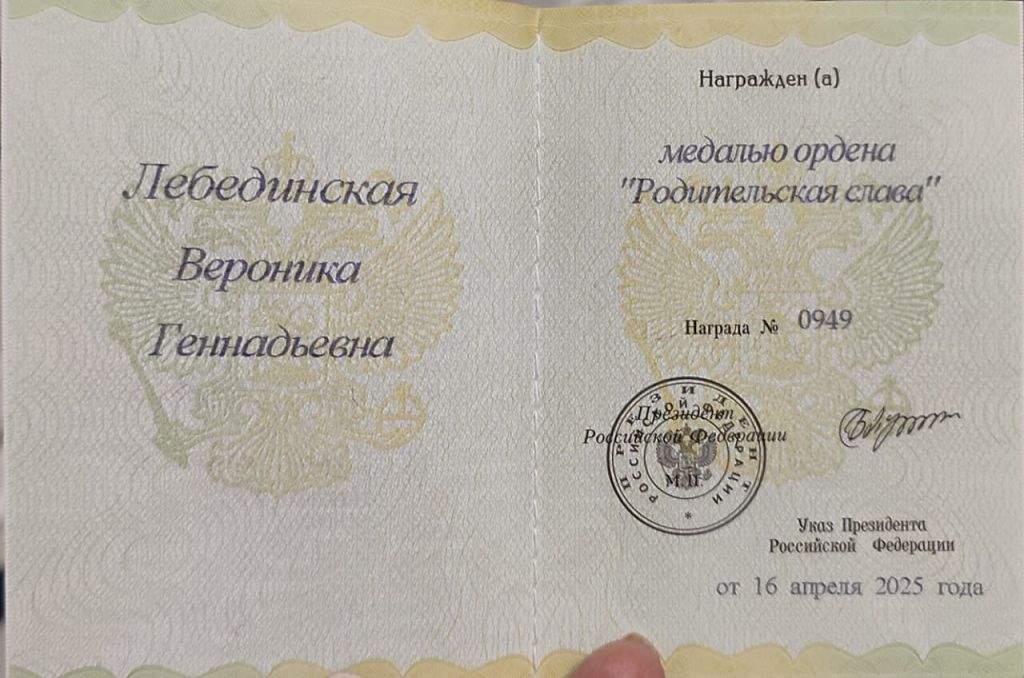награда - орден "РОДИТЕЛЬСКАЯ СЛАВА".🌟